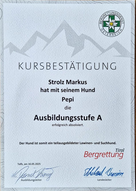 Nun ist es offiziell, Pepi und Markus haben die Teilausbildung Lawinenhund und Suchhund bestanden. Jetzt kann das geniale Team auf die nächste Ausbildungsebene konzentrieren.